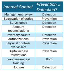 Some internal controls can help prevent fraud from happening in the first place, while others serve as a detection method. To demonstrate the purpose that these controls serve, let’s look at a few examples.