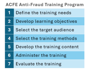 There are many ways to build an effective fraud training program. The ACFE encourages businesses to follow a seven-step process when designing their fraud training program: